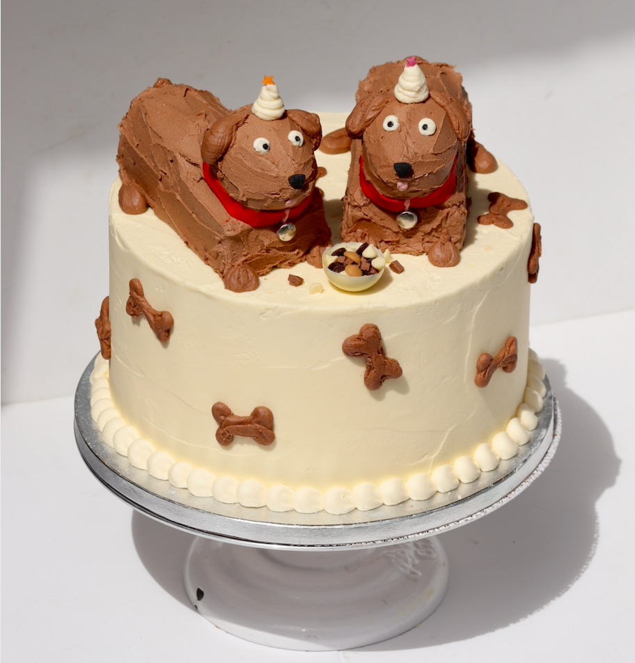 Meet Betty and Basil - two Swiss roll sausage dogs, covered in Belgian chocolate buttercream and finished with completely edible collars and party hats. Complete with white chocolate bowl of treats - chocolate chips.