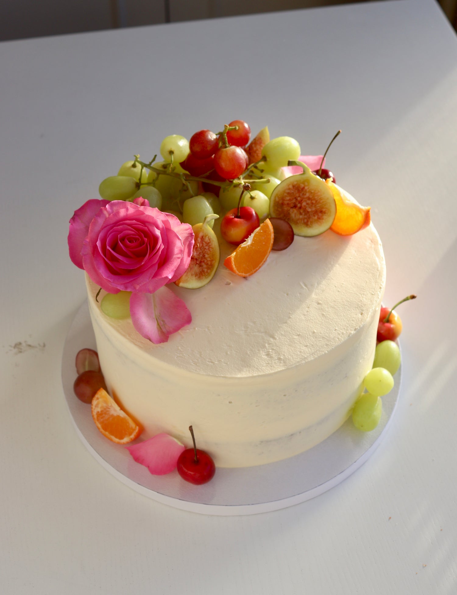 Decorated with a semi-naked buttercream finish and topped with seasonal fruit and flowers.