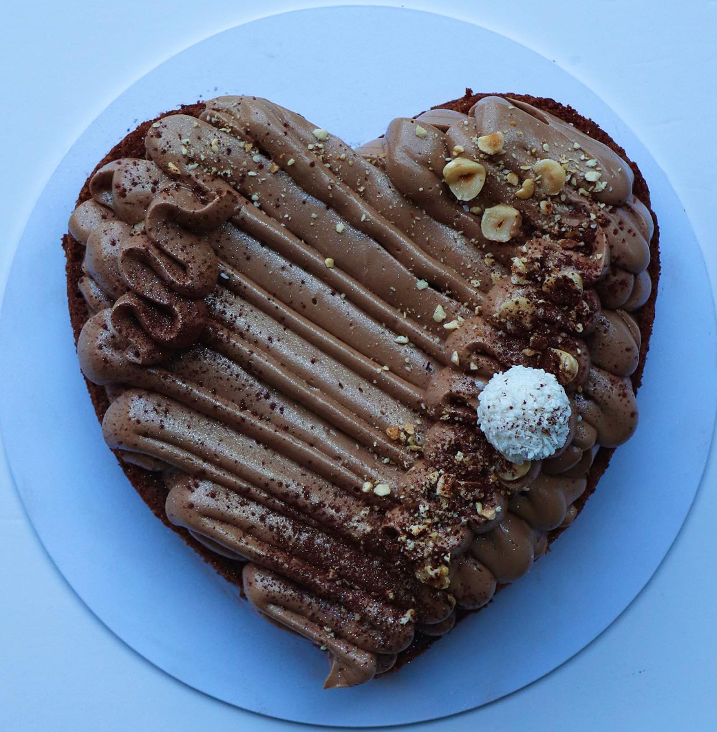 Soft, almond and Belgian chocolate sponge, topped with silky Swiss meringue buttercream that melts in the mouth. Decorated with roasted hazelnuts, Swiss cocoa and a truffle.
